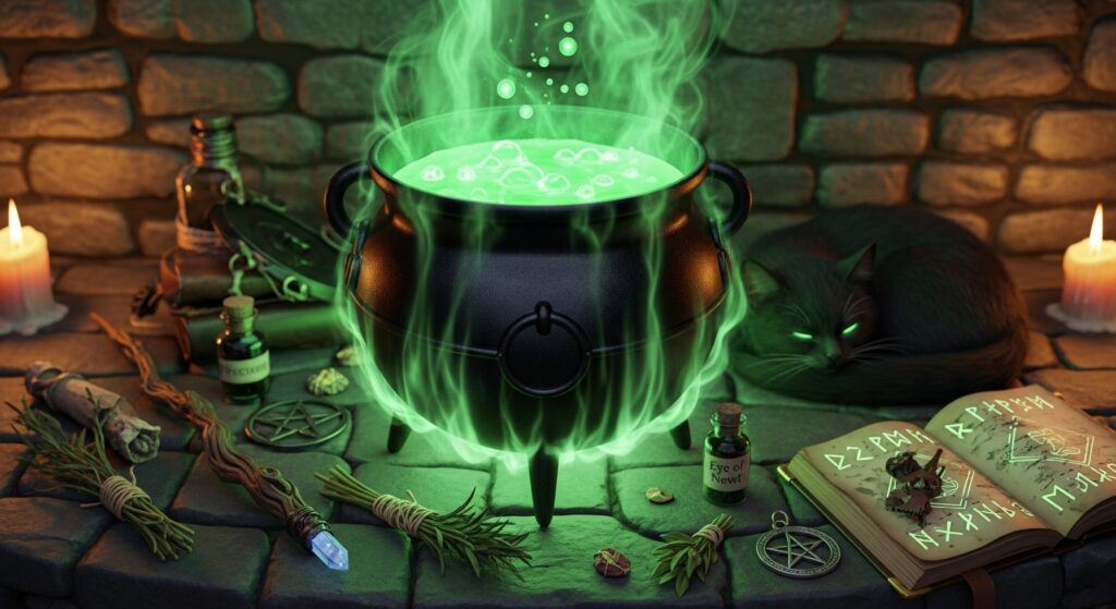 Create a bubbling witch’s brew setup using a cauldron with dry ice or a fog machine. Surround it with broomsticks and witch hats to complete the spellbinding scene.