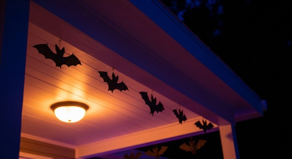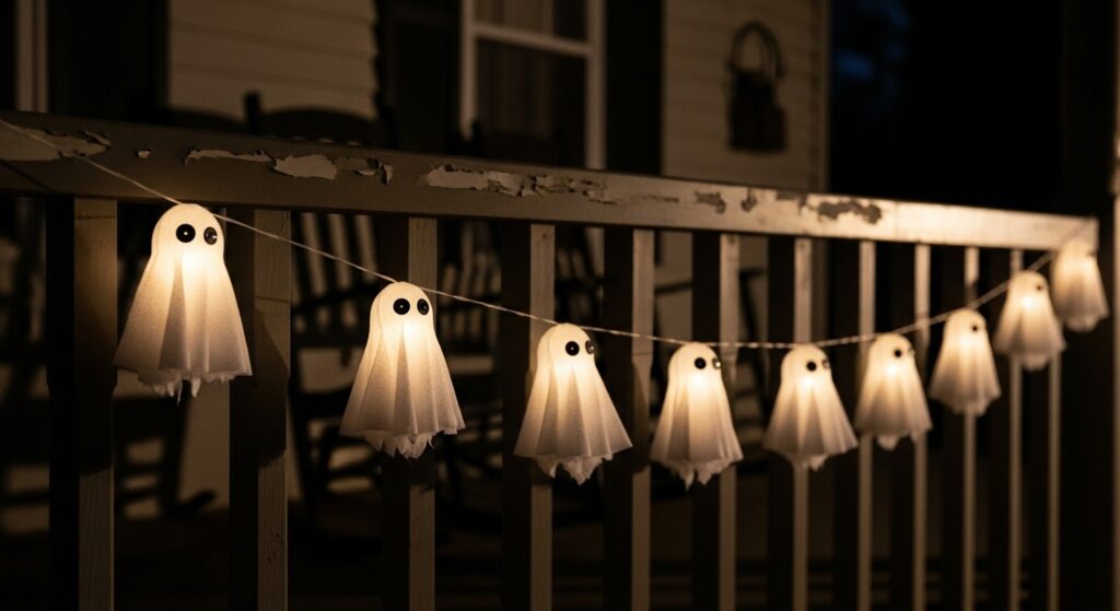 String together mini ghost figures made from fabric and hang them along the porch railing. It’s a fun and spooky touch that sways with the wind.