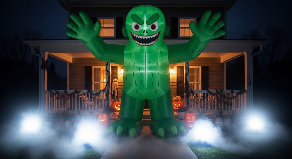 A large inflatable ghoul or pumpkin monster instantly adds dramatic flair. It’s a bold and fun centerpiece that pairs perfectly with spooky lighting.