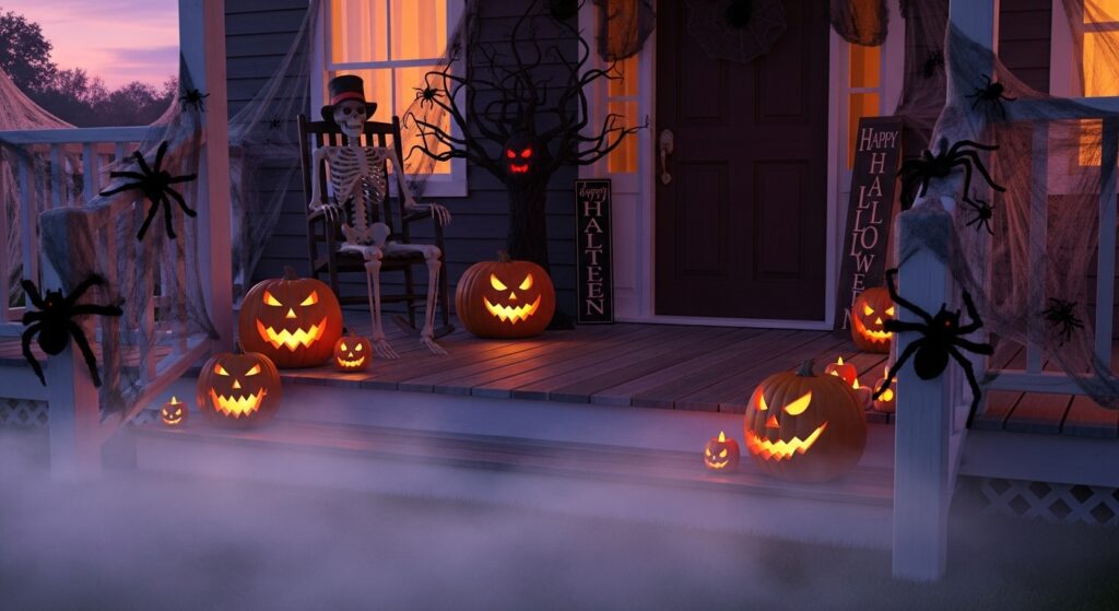 Drape oversized spider webs across railings and add giant fake spiders. The realistic textures and black detailing instantly turn your porch into a haunted hideout.