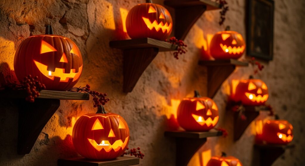 Attach small shelves or brackets to display multiple jack-o’-lanterns at different heights. The uneven candlelight creates haunting shadows on the walls.