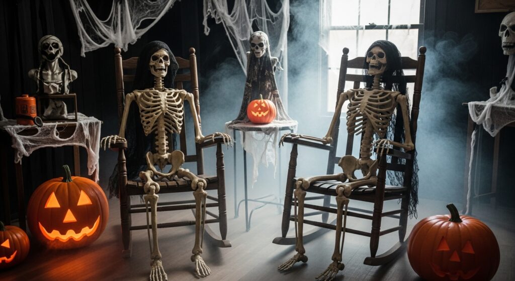 Position life-sized skeletons sitting on chairs or holding candy bowls. Dress them up for humor or keep them bare for pure creepiness — either way, they’ll steal the show.