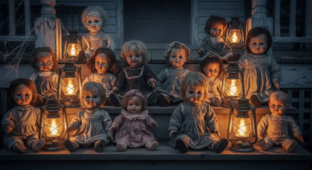 Scatter vintage dolls on the porch or hang them from string lights. Their eerie eyes and cracked faces add unsettling charm, especially under dim lighting.