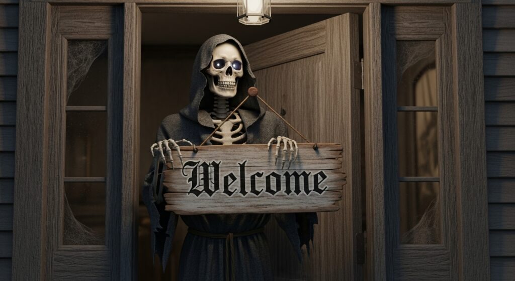 Place a full skeleton holding a welcome sign at your entryway. Dress it in tattered clothes for extra creep factor — the perfect spooky host for trick-or-treaters.
