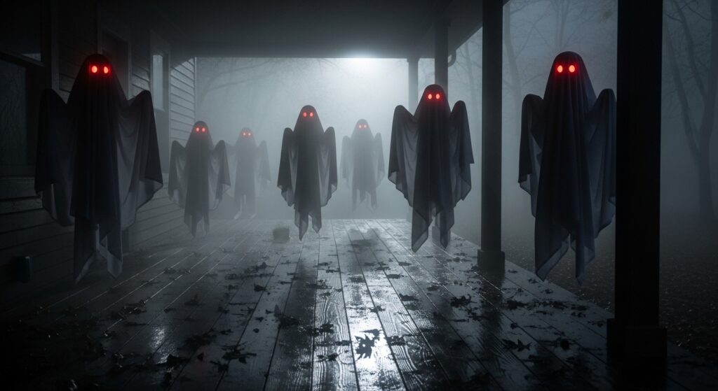 Hang floating ghosts made from white sheets and LED lights near your entryway. The gentle sway in the wind adds eerie movement, making your porch come alive at night. Pair it with soft fog for an even creepier vibe.