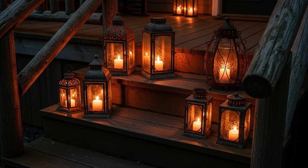 Use flickering lanterns and LED candles to cast haunting shadows across your porch. The low, warm light gives an old, gothic cemetery effect that’s both chilling and classic.