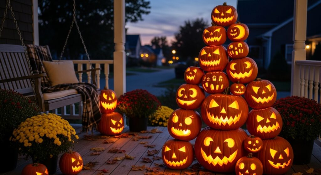 Stack pumpkins of different sizes and faces to create a totem-like structure. The glowing stack gives a playful yet spooky focal point for your porch.