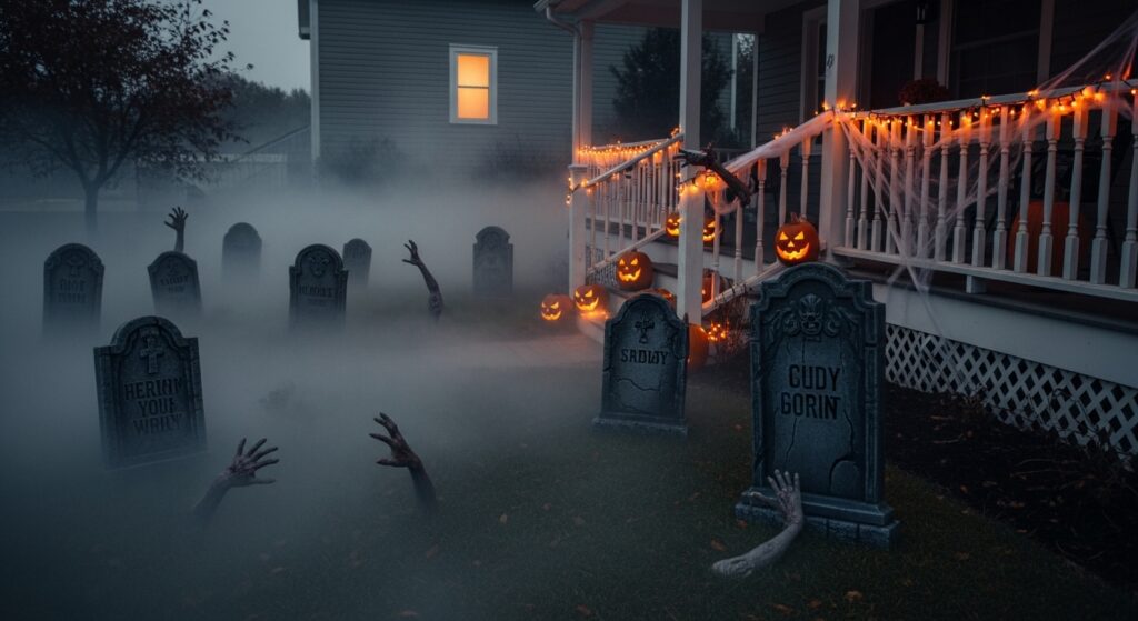 Add foam tombstones and half-buried zombie hands emerging from the ground. Use a green light or fog effect for that spine-chilling cemetery look.