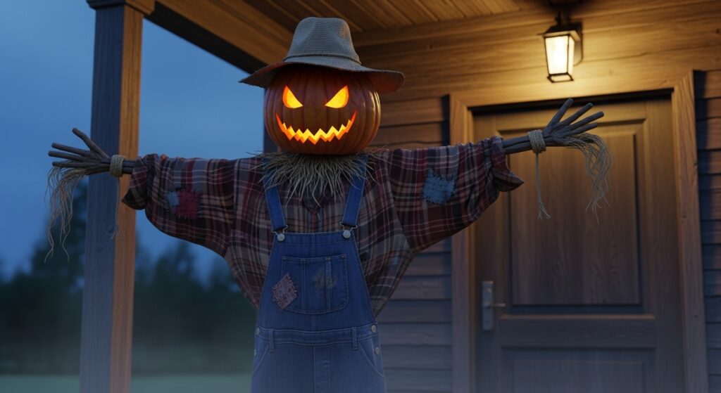 Create a scarecrow with a torn cloak and glowing eyes to guard your front door. It’s the perfect mix of rural charm and Halloween horror.