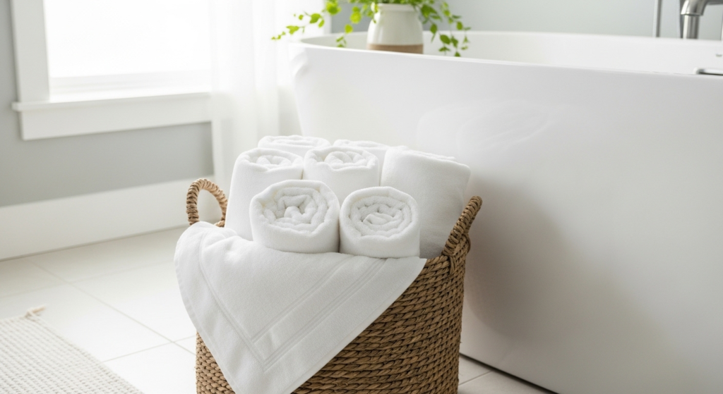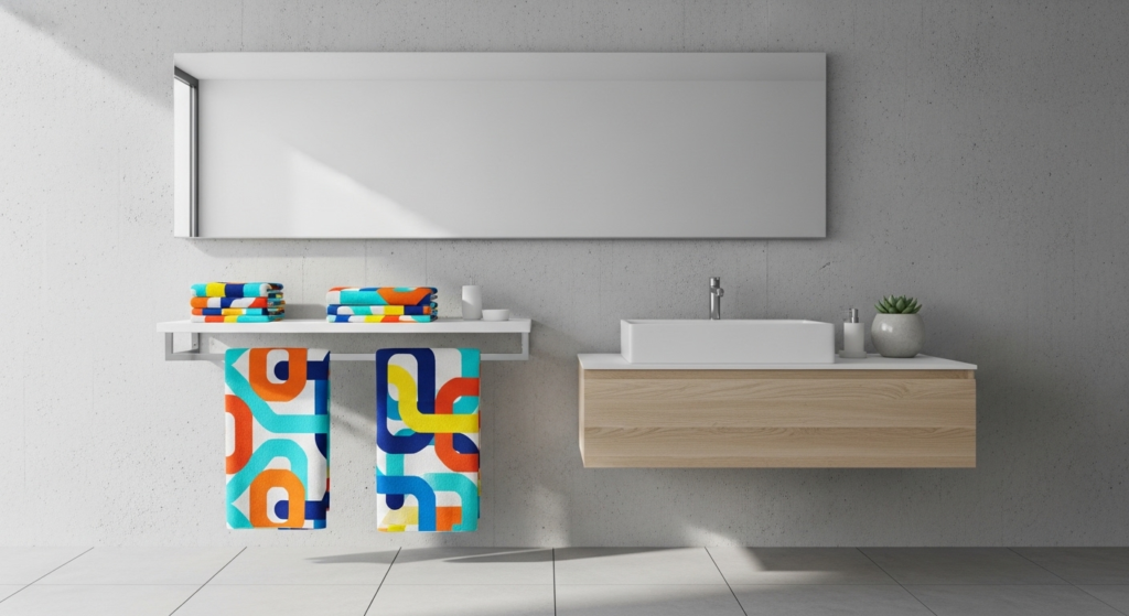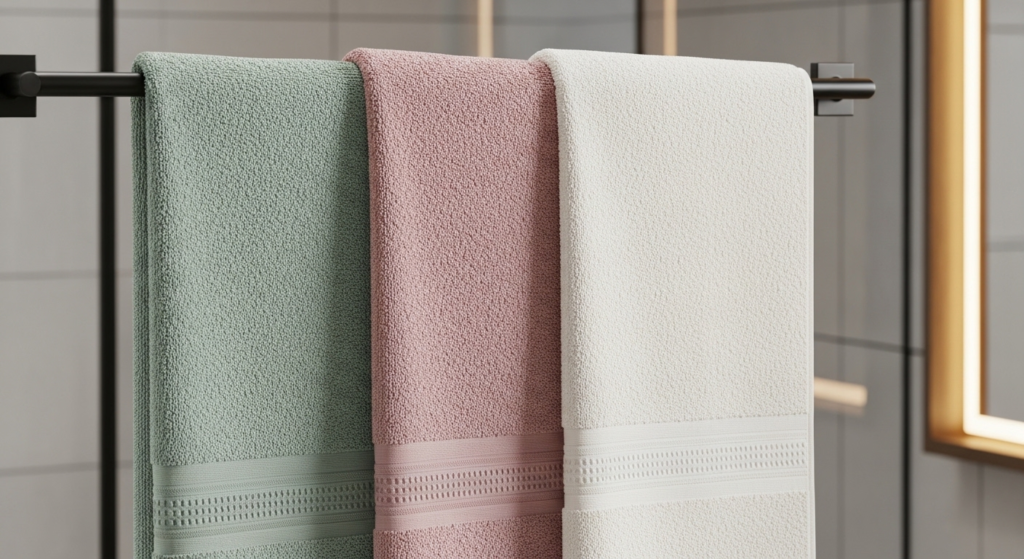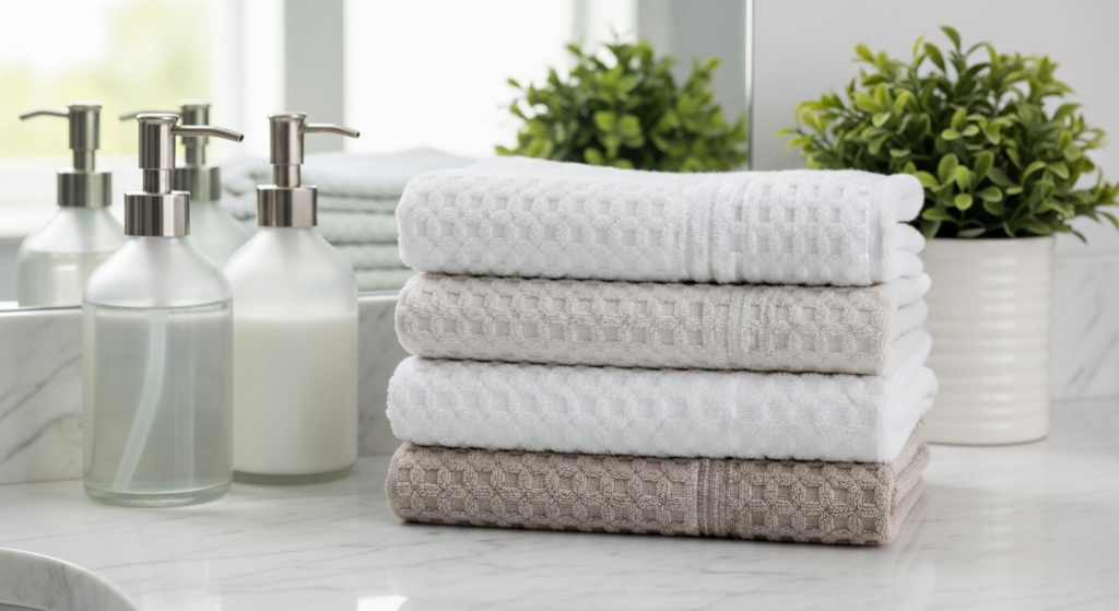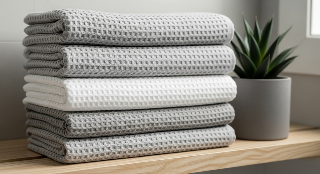Waffle weave towels are lightweight, absorbent, and budget-friendly. Their unique texture dries quickly while giving a subtle boutique look. Perfect for small bathrooms, they combine practicality with a designer feel.